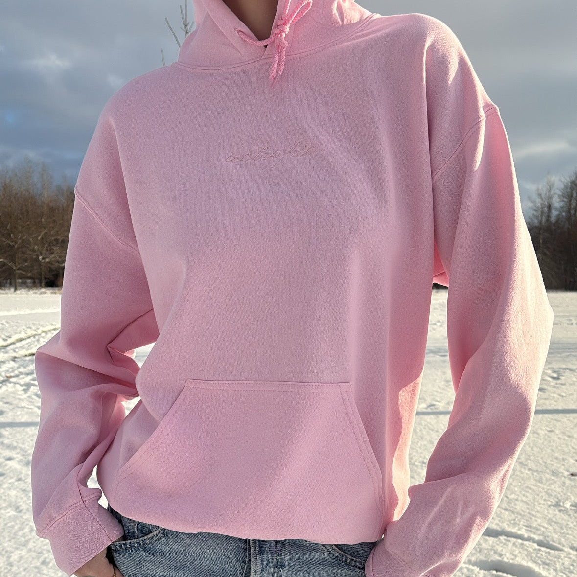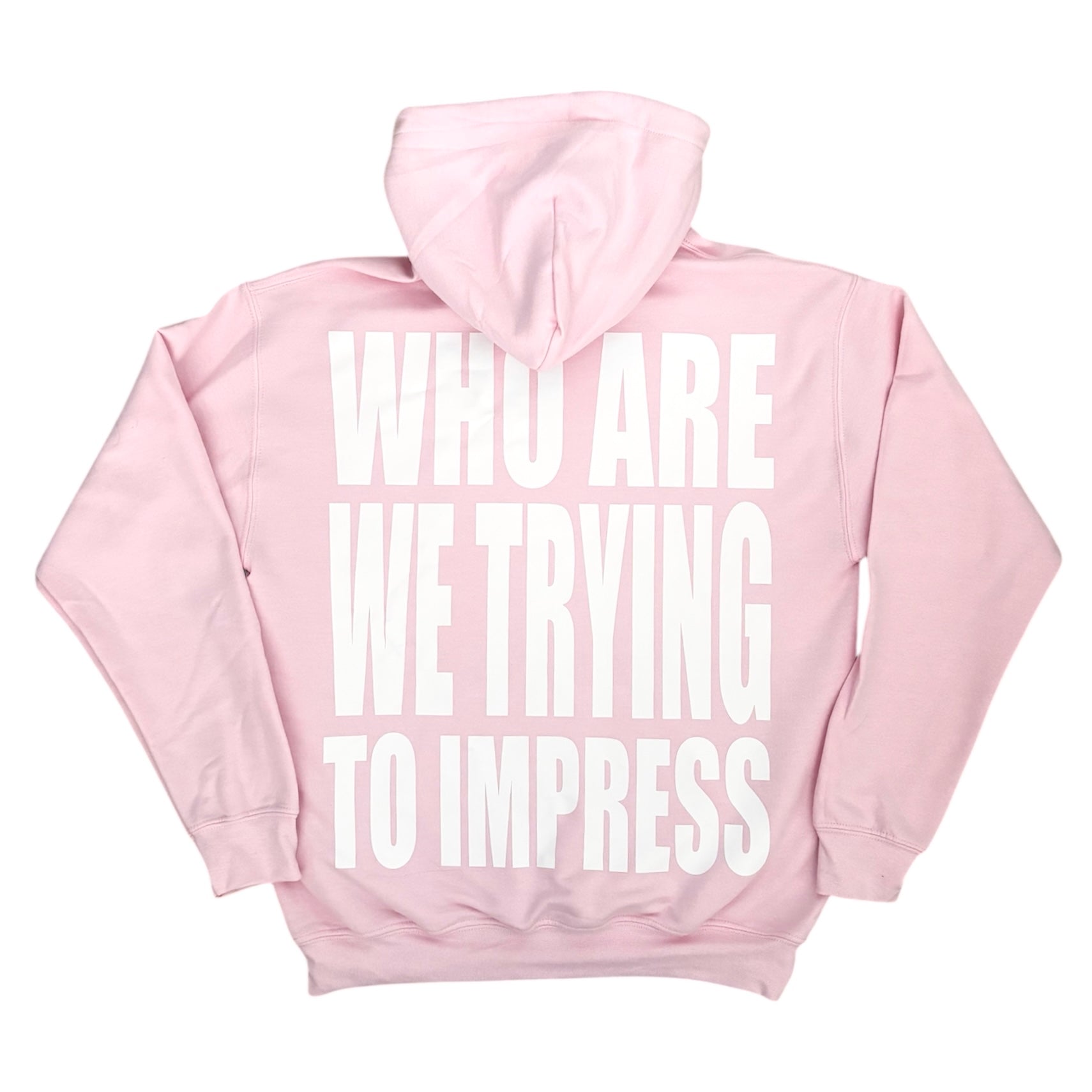 The Who Are We Trying to Impress Hoodie is designed to balance softness with a statement. Made in a light pink tone, this unisex hoodie features gentle cursive embroidery on the front for a subtle, refined look, paired with a large graphic on the back that delivers the message boldly.